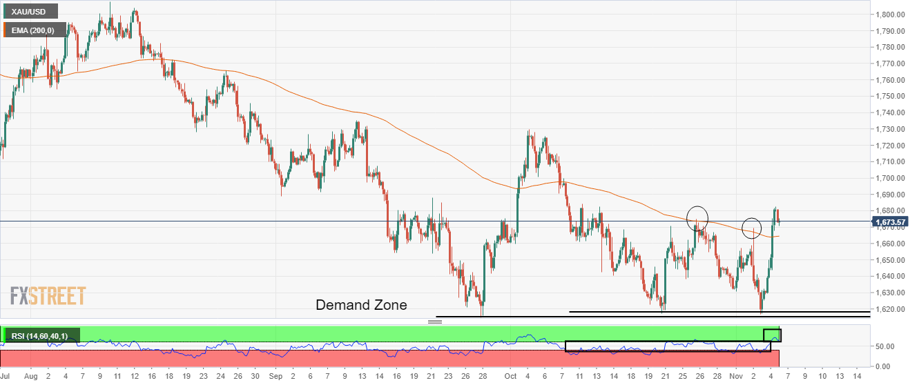金价测试了4小时图上窄幅区间1,615.70-1,618.64美元的需求区域后大涨。 200EMA均缐位于1,664.20美元,早前构成阻力位,但未来不会构成支撑位。
