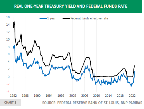 美联储会在什麽水平停止提高联邦基金利率?这个问题对美国经济的活动和需求以及金融市场都极為重要。在最近的新闻发布会上,美联储主席杰罗姆·鲍威尔对联邦公?市场委员会的反应功能含糊其词,但他确实提到了他们将关注实际利率。这就提出了一个问题,用哪种通胀指标来从名义利率转向实际利率?一个可能的解决方案是使用克利夫兰联邦储备银行(Federal Reserve Bank of Cleveland)计算的通胀预期期限结构。侭管最近大幅上涨,但除2018年外,一年期实际国债收益率仍低于前几次紧缩周期期间达到的水平。在通胀上升的背景下,紧缩周期显然不会结束。侭管美国1年期国债的实际收益率最近大幅上升,但仍低于此前紧缩周期期间达到的水平。美联储的工作还没有结束。