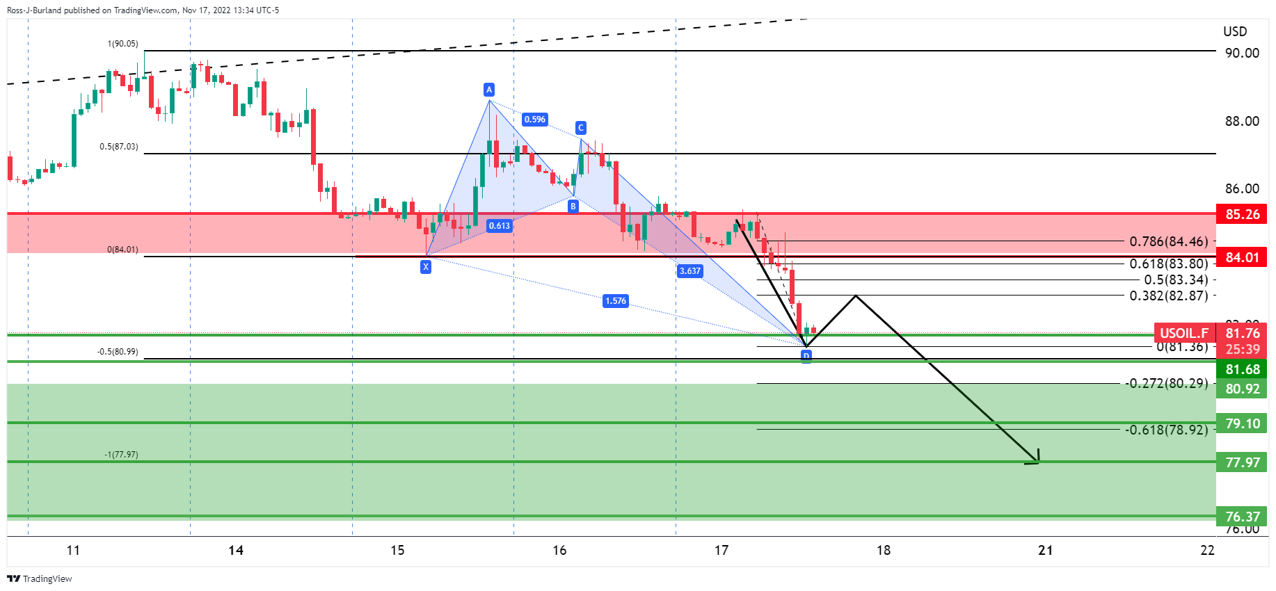 WTI油价小时图显示,将WTI油价原有震盪区间扩大100%,表明WTI油价将测试78.00美元。然而,Grab谐波模式显示,WTI油价将出现整理。看跌趋势的38.2%斐波位处在82.90美元附近。