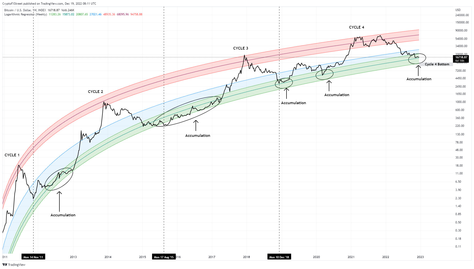 如果将对数回归应用于过去11年的比特币价格历史,它揭示了一个有趣的模式。从图中可以看出,比特币在进入绿色区间出现了底部,?始是积累,随后是趋势反转。