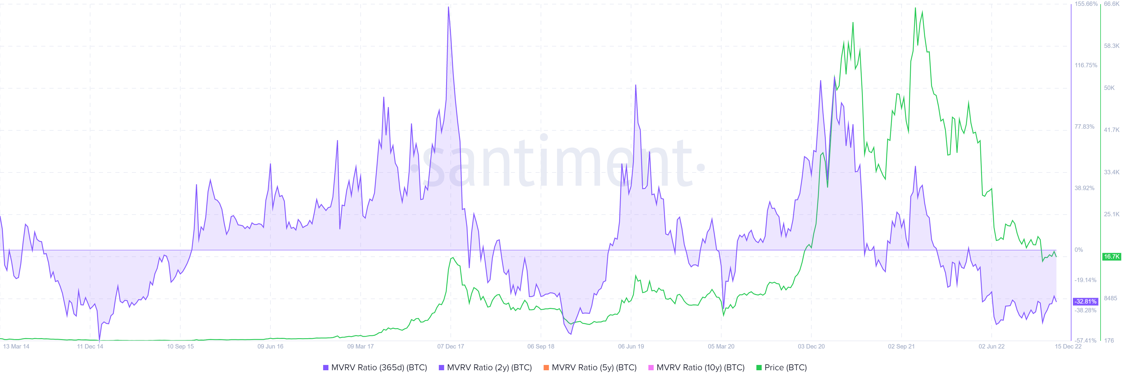 6月的骤降和11月的闪崩导致365天的MVRV达到-45%,这与2020年的水平相吻合。然而,链上指标与2018年和2014年的水平仍有很大距离。这一数据表明,未来比特币价格可能会出现小幅下跌趋势。