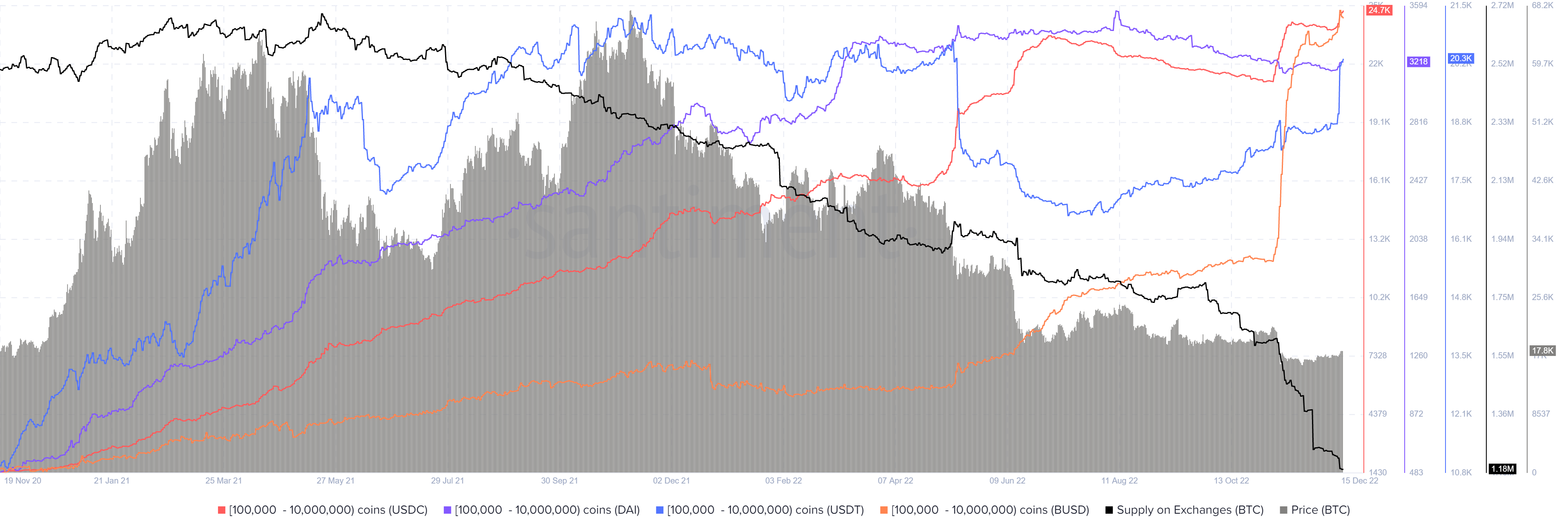 从下面的图表中可以看出,在11月第一周FTX的初步下跌后,持有10万到1万美金的USDC和BUSD鲸鱼地址?始增持。对于USDT和DAI,这些地址在12月的第一周?始积累。