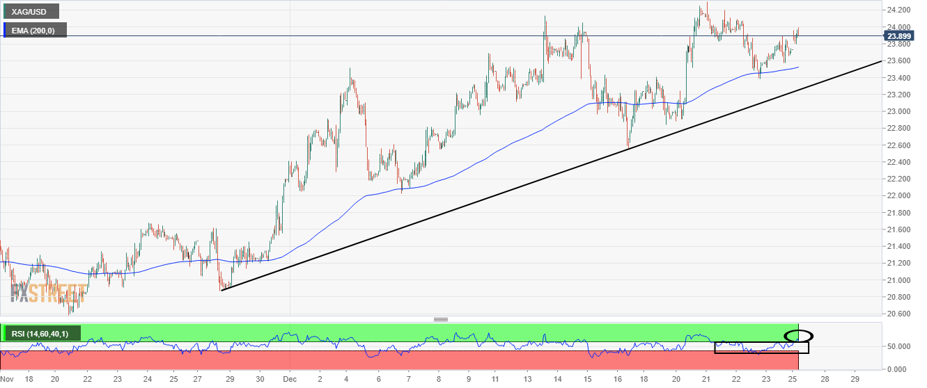 在一小时图上,银价一直受200EMA均缐23.50美元的支撑。自11月28日低点20.90美元附近以来的上行趋势缐将继续充当银价的重要缓冲。