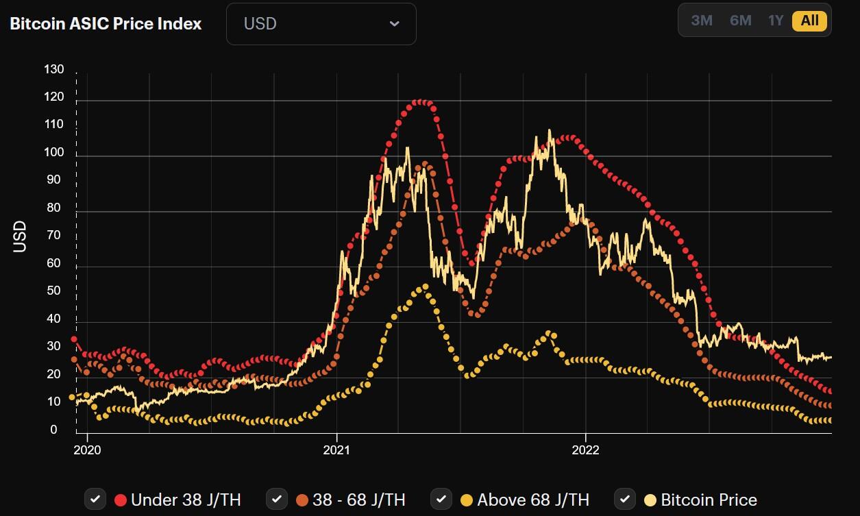 比特币ASIC矿工——专為挖掘比特币而优化的机器——目前正在以自2020年和2021年以来从未见过的最低价格出售,这被视為加密熊市深化的另一个迹象。