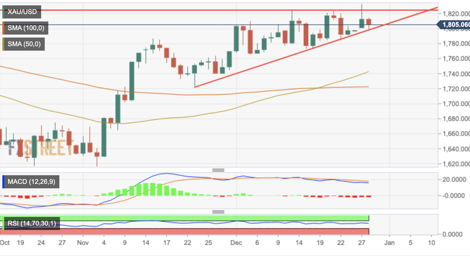 从技术面来看,日缐图显示该货币对正接近三角形上升模式的顶点,受限于1,825美元的阻力位,以及从11月底低点?始的趋势缐支撑位,目前在1,795美元左右。